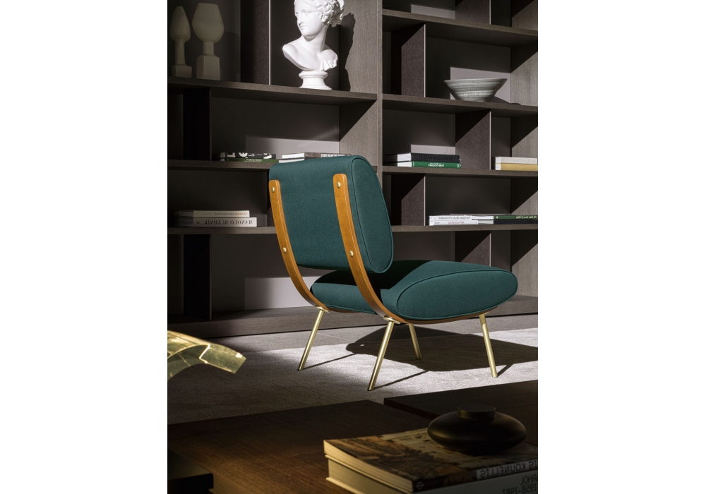Round D.154.5 diseñada por Gio Ponti para Molteni&C es una butaca icónica con formas muy modernas, incluso “espaciales”, nunca antes pensadas. El nombre deriva de la forma redondeada del asiento y los respaldos. Utiliza materiales y tecnologías de última generación para su construcción, como el uso de Vipla (material plástico imitando la piel) para la tapicería, contrachapado curvo para unir respaldo y asiento, y pies metálicos con punta antideslizante fácil. ensamblable. También se define, dentro del estudio Ponti / Fornaroli / Rosselli, "Ocho piezas". De hecho, son ocho las piezas que la componen: respaldo, asiento, dos elementos de madera contrachapada curvados y cuatro patas, que atornillando al asiento mantienen todo unido.