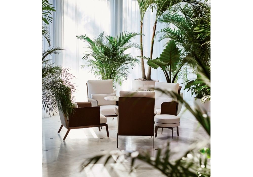 Happy Hour diseñado por Antonio Citterio para Flexform es un sillón realizado con estructura metálica, asiento y respaldo tapizados en cuero y cojines acolchados de pluma de ganso tapizados en cuero o tela.