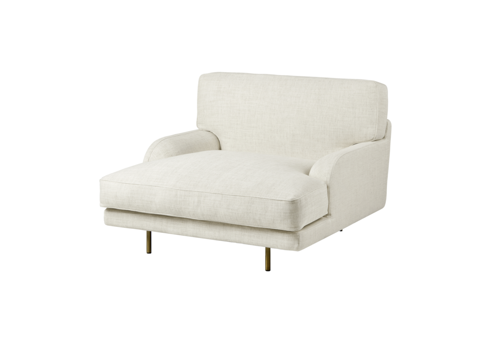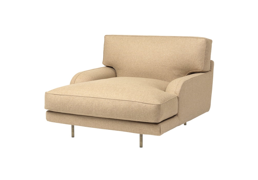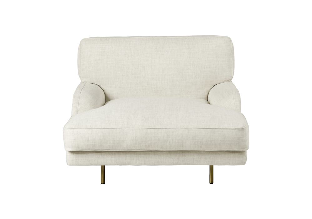 Flaneur diseñado por GamFratesi para Gubi es un sillón disponible con tapizado en tela o cuero y base pintada en negro mate o latón envejecido.