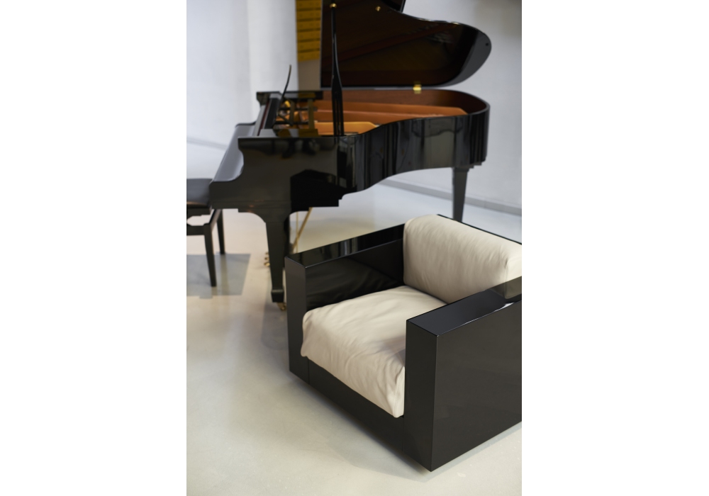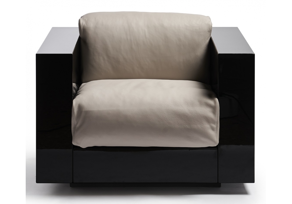Saratoga diseñada por Lella & Massimo Vignelli para Poltronova es una butaca realizada con estructura de madera lacada en poliéster brillo y cojines tapizados en piel. Disponible en diferentes acabados.