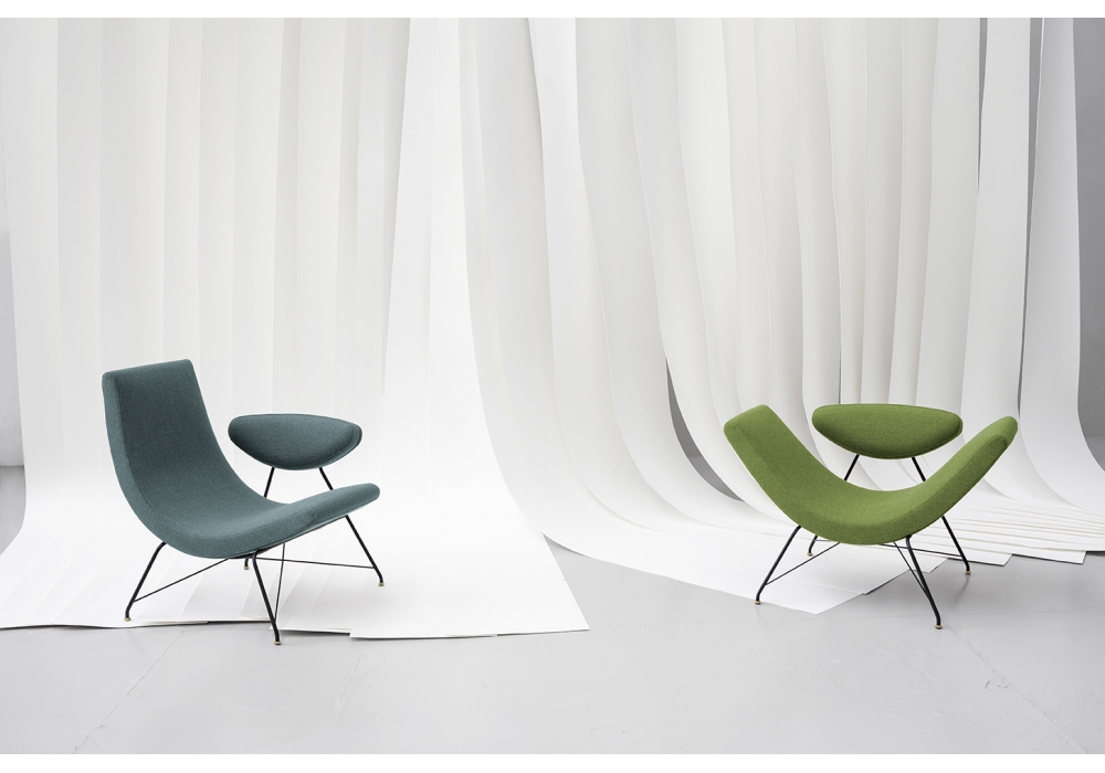 Reversivel diseñado por Martin Eisler para Tacchini es un sillón con respaldo en contrachapado de álamo, asiento con inserto de hierro y correas elásticas y base de metal pintado. Los pies son de hierro cromado, mientras que la funda no desenfundable está disponible en diferentes tejidos y colores.