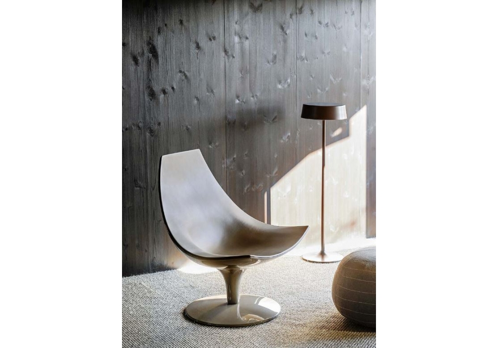 Moon diseñado por Pietro Arosio para Tacchini es un sillón con estructura en poliuretano rígido y resina. La carcasa está pintada brillante, en diferentes acabados. La tapicería del asiento no es desenfundable, disponible en diferentes acabados. Giro de 360 °.