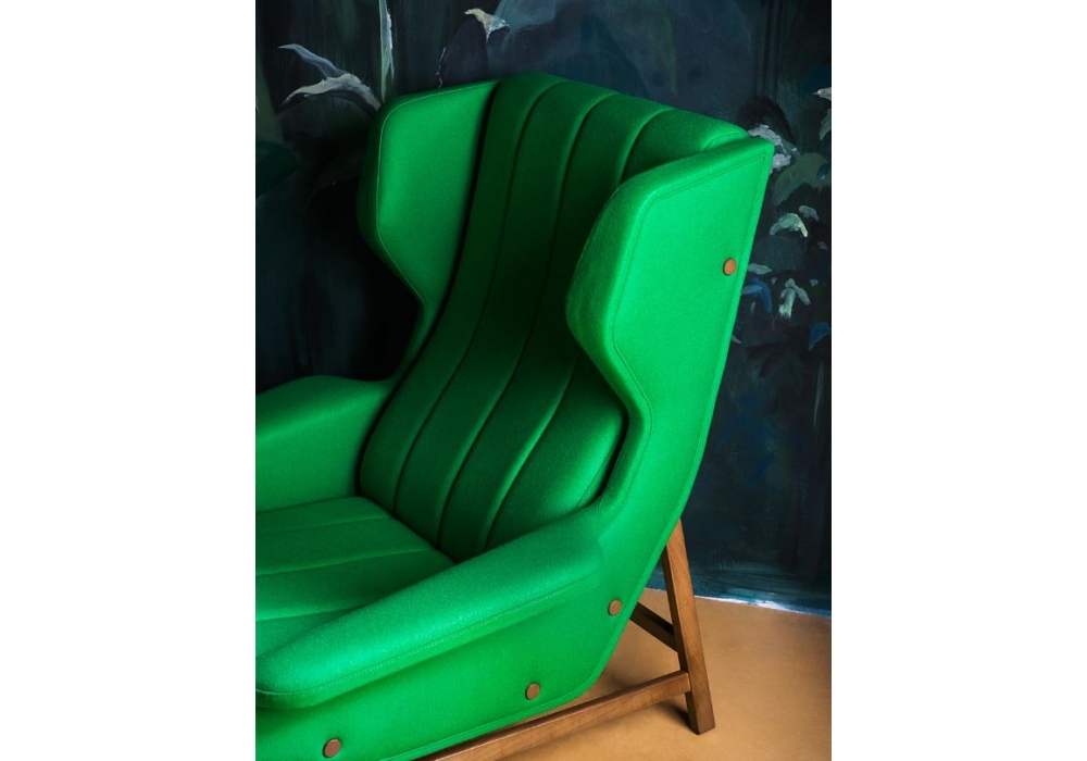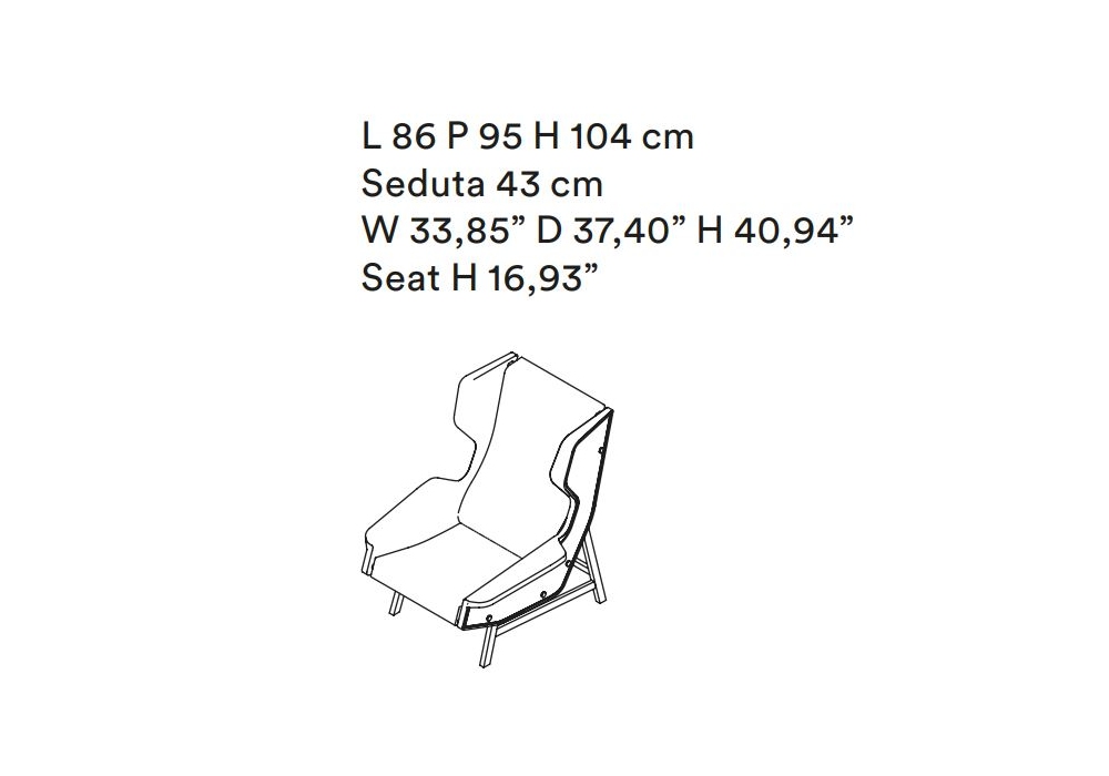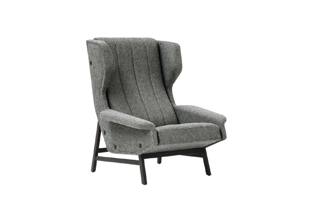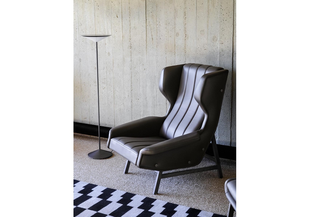 Giulia diseñada por Gianfranco Frattini para Tacchini es una butaca con estructura interna en contrachapado de abeto, acolchado en espuma de poliuretano multidensidad. La base es de fresno macizo teñido a poro abierto, en diferentes acabados. La tapicería está disponible en tela o cuero, en muchos colores.
