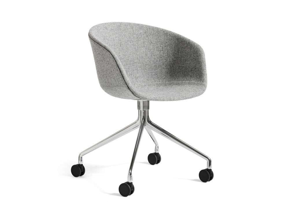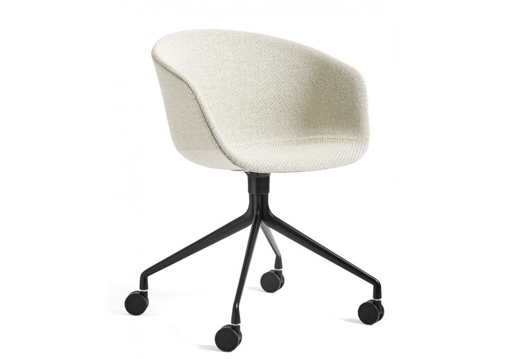 About a Chair AAC 25 diseñada por Hee Welling & Hay para Hay es una butaca giratoria con carcasa de polipropileno moldeado por inyección con reposabrazos, tapizado completo y base giratoria de 4 radios en fundición de aluminio con ruedas negras y brillantes suministrada con la base negra y blanca con goma gris para la base blanca. Disponible en diferentes tapizados.