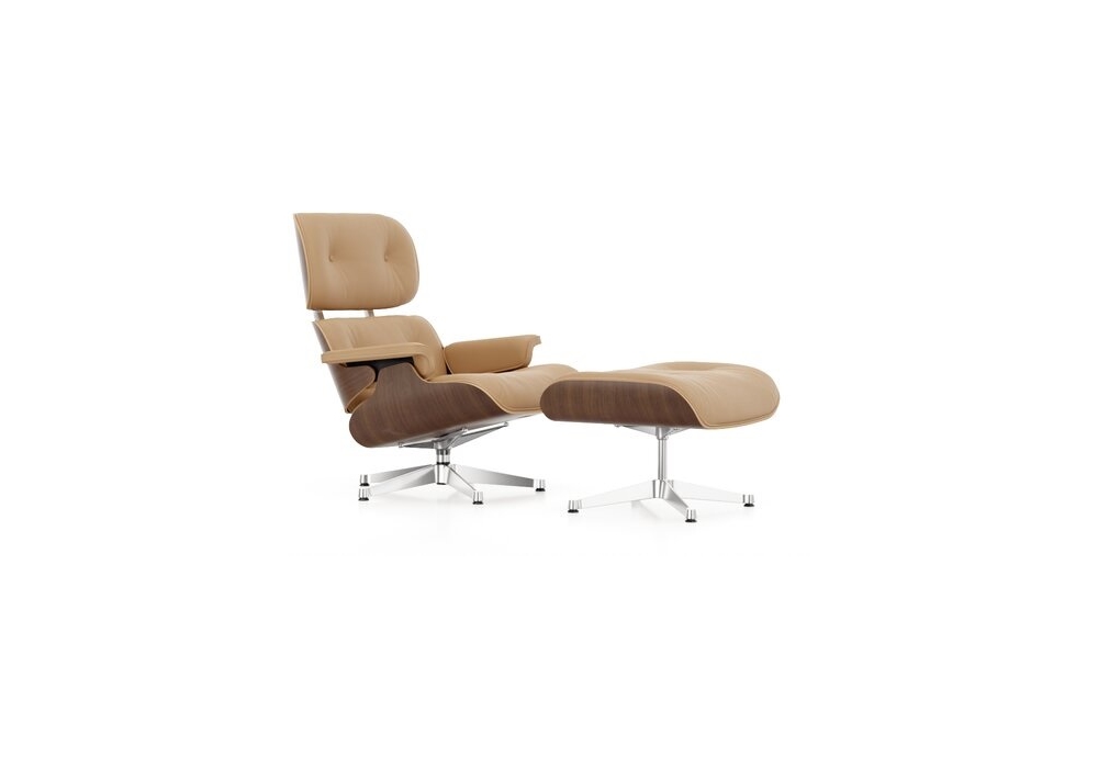 Lounge Chair & Ottoman diseñada por Charles & Ray Eames para Vitra es una butaca con reposapiés realizado con revestimiento de cuero, base en aluminio pulido o con laterales negros y patines duros o con inserciones de fieltro. Carcasa de nogal pigmentado negro.