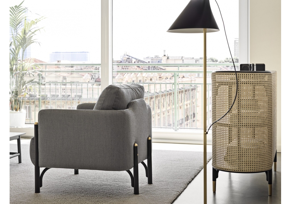 Jannis diseñado por Dainelli Studio para Gebrüder Thonet Vienna es un sillón lounge con estructura en haya curvada, elementos decorativos en latón. Asiento acolchado con espuma de poliuretano, cojines viscoelásticos. Tapicería disponible en tela o piel en diferentes acabados.