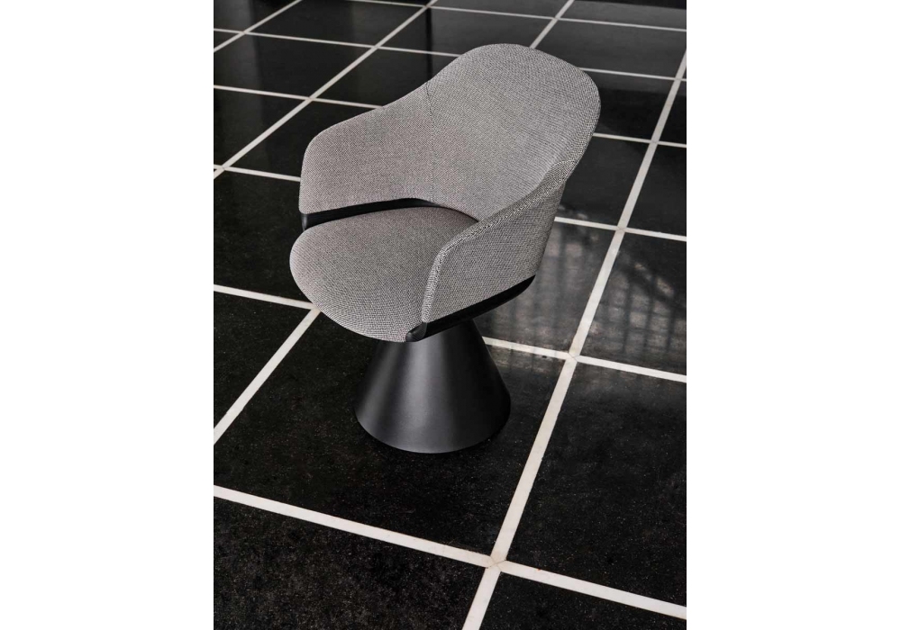 Lyz diseñada por Mario Ferrarini para Potocco es una butaca estructurada por la combinación de metal y madera de fresno o nogal canaletto en diferentes acabados. La base tiene forma cónica en metal pintado gofrado negro o antracita. El asiento y el respaldo están acolchados con espuma de poliuretano ignífuga y revestidos de varios tipos de tejido, piel o ecopiel.
