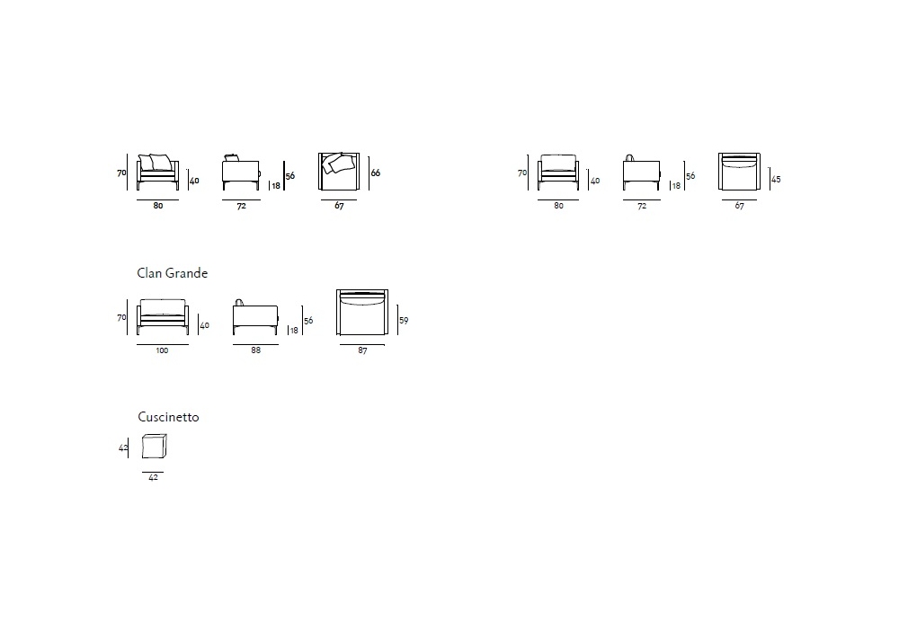 Clan diseñado por Piero Lissoni para Living Divani es un sillón con estructura portante en madera y contrachapado curvado preformado con acolchado en espuma de poliuretano de densidad diferenciada; suspensión del asiento con correas elásticas tejidas en caucho revestido. Acolchado en espuma de poliuretano de densidad diferenciada. Cojines decorativos de 42x42cm en pluma de ganso. Revestimiento en piel o tejido totalmente desenfundable. Pies realizados en chapa de acero, pintados con polvos epoxi en color gris plomo o bruñido. Deslizadores en material termoplástico.