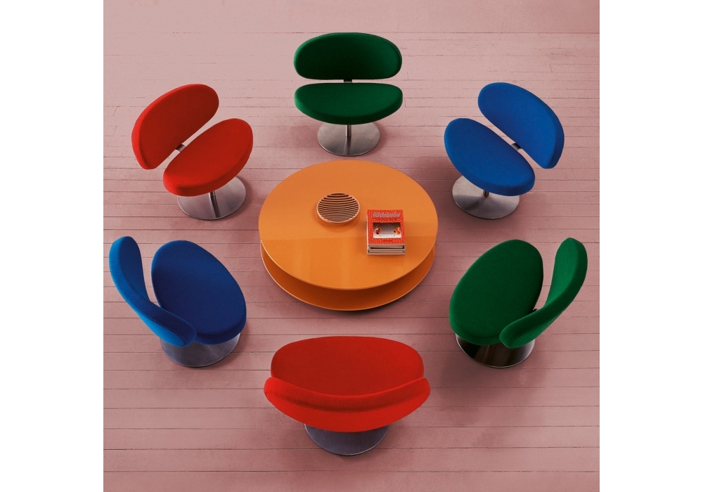 Sunset diseñada por Christophe Pillet para Cappellini es una butaca giratoria con base de metal en diferentes acabados, asiento y respaldo acolchados. Revestimiento fijo en piel o tela.