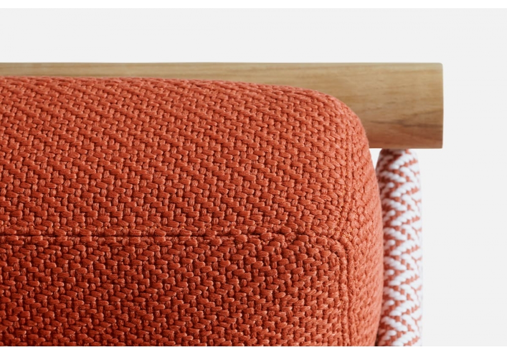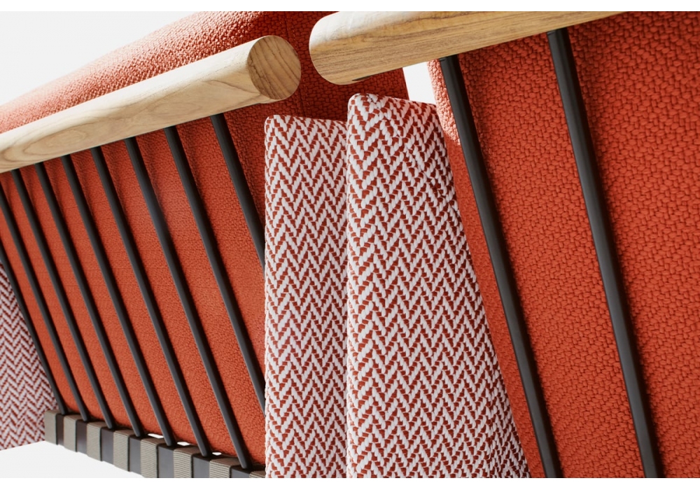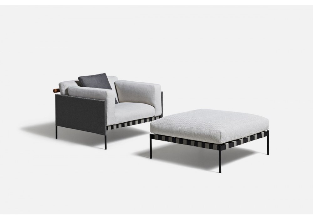 Etiquette Outdoor diseñada por Gam Fratesi para DePadova es una butaca para exteriores con estructura en acero inoxidable negro, respaldo en teca natural maciza tratada con aceite y patas regulables en metal pintado negro mate. Los cojines de asiento y respaldo están confeccionados con funda desenfundable con tejido de exterior en diferentes acabados. También disponible el puf en el mismo acabado.