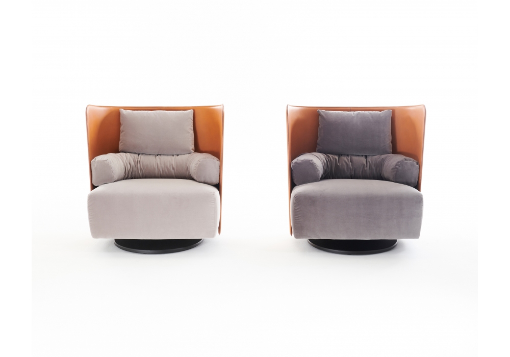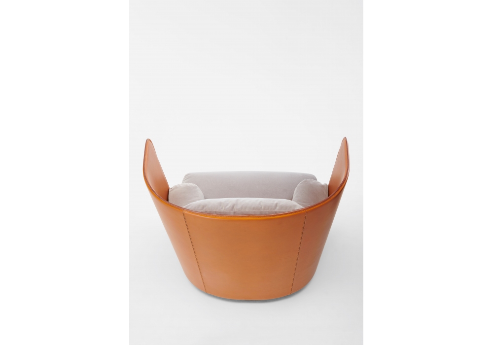 880 Campiello + diseñada por De Pas, D'Urbino, Lomazzi para Zanotta es una butaca con respaldo en madera contrachapada revestida en piel, asiento en poliuretano con cita diferenciada / escamas de poliéster regenerado y tapizado externo desenfundable en tejido. Solo se puede pedir el cojín lumbar en otro color dentro del mismo tipo de tejido.