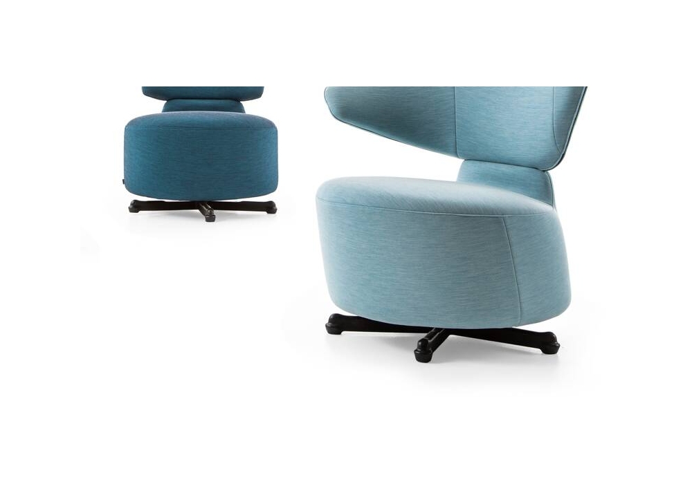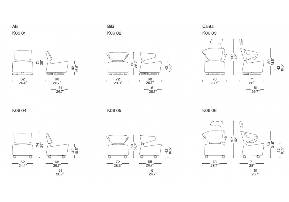 K06 Aki - Biki - Canta diseñada por Toshiyuki Kita para Cassina es una colección de sillones giratorios con base fija o ruedas. Estructura de acero tubular con correas elásticas, relleno de espuma de poliuretano y guata de poliéster, y tapizado en tela o piel. Disponible en diferentes modelos.