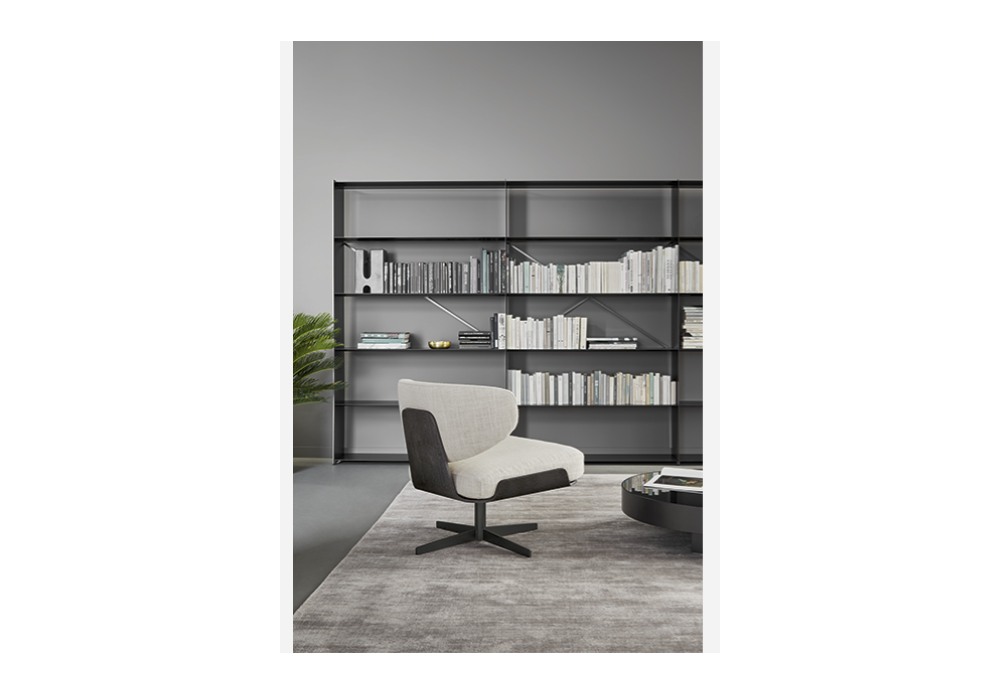Olos diseñado por Mauro Lipparini para Bonaldo es un sillón con tapizado fijo, disponible en diferentes tejidos y colores. La estructura es de madera chapada en nogal canaletto o roble carbón. La base giratoria está fabricada en metal, en varios acabados.
