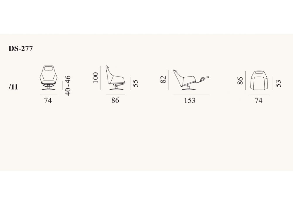 DS-277 diseñado por Christian Werner para De Sede es un sillón con estructura de metal con correas integradas. Función de rotación de 360 ° y asiento ajustable hasta máx. 17° atrás. Soporte para la nuca continuamente ajustable y reposapiés extensible. Tapicería en tela o piel en diferentes acabados, la tela externa está disponible solo en combinación con la tela interna.