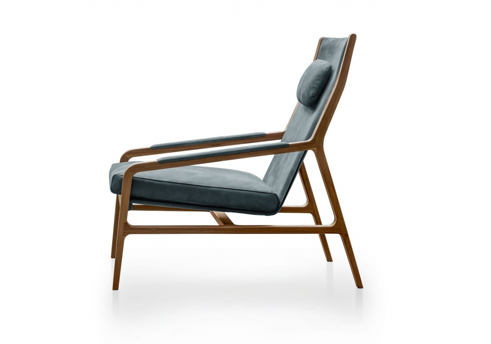 Margot Relax diseñada por Giuseppe Bavuso para Alivar es una butaca con puf realizada con estructura en nogal nacional macizo. Cuerpo de chapa perforada pintada, revestido de cuero con inserción de goma de poliuretano. Reposacabezas magnético y ajustable. Cojín de asiento en espuma de poliuretano y forro de fibra de poliéster, revestido en piel. En tela bajo pedido.