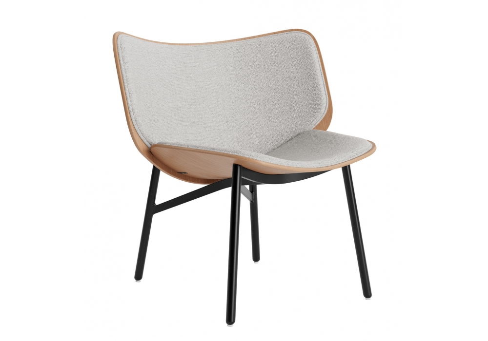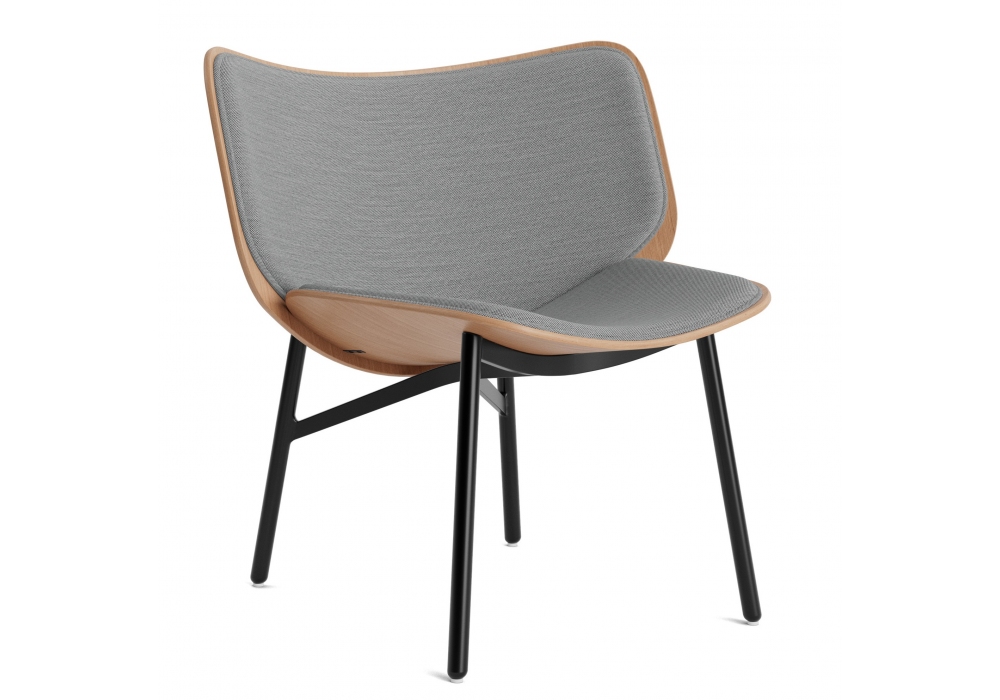 Dapper diseñada por Doshi Levien para Hay es una butaca formada por dos carcasas en forma de contrachapado de roble, revestimiento interno en cuero o tela y patas en acero pintado en polvo negro. Disponible en diferentes tapizados.