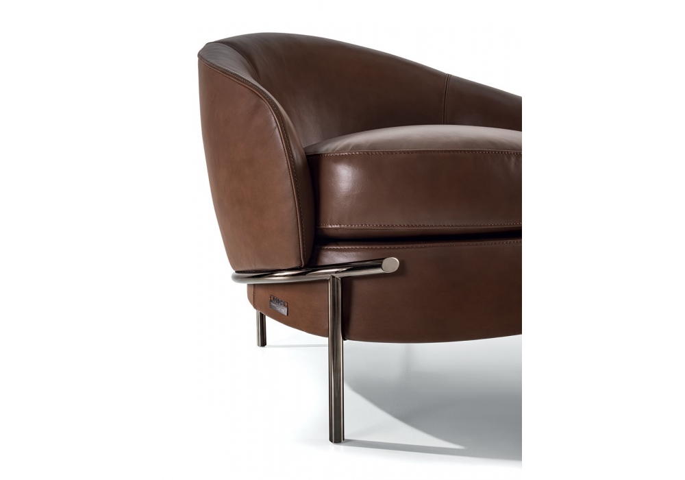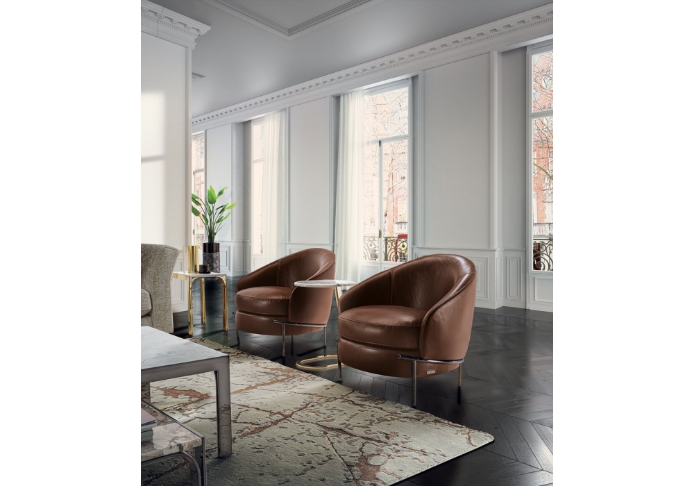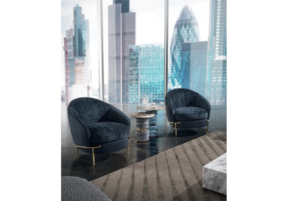 Lloyd diseñada por Giuseppe Iasparra para Longhi es una butaca con estructura en metal mate o brillante y asiento en madera recubierta de espuma de poliuretano de media densidad recubierta de fibra de poliéster acoplada con tnt. Tapicería en tela o piel no desenfundable, a excepción del cojín del asiento.