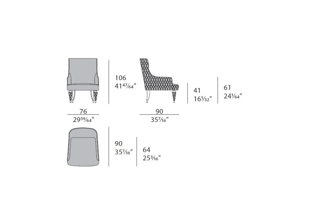 Numero Tre diseñada por Roberto Serio para Turri es una butaca bergere con estructura en madera contrachapada y madera maciza tapizada con espuma de poliuretano de diferentes densidades. Tapicería en tela o piel. Capa exterior acolchada con patrón de rombos. Patas en madera maciza con tapizado en piel.