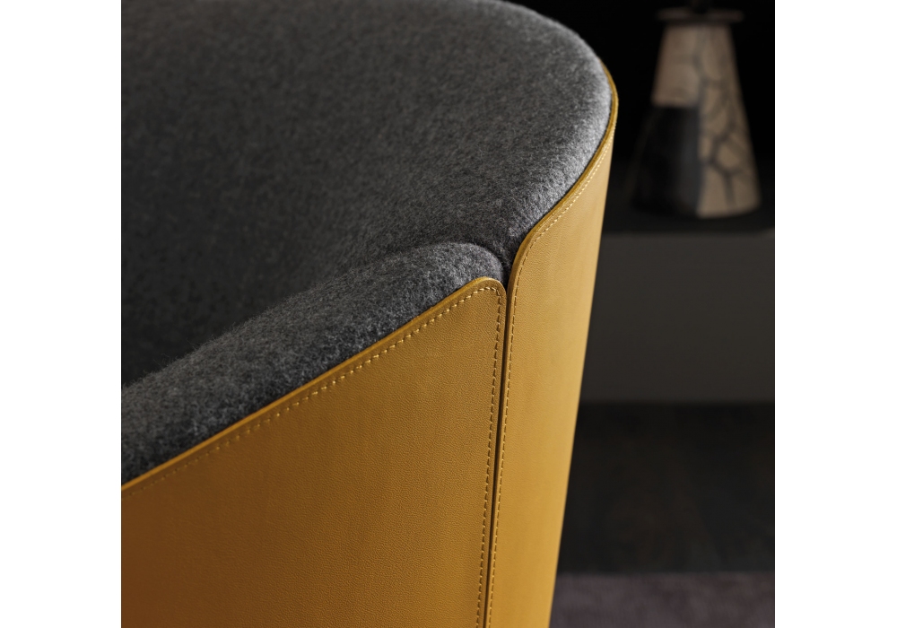 Violetta diseñada por Mauro Lipparini para MisuraEmme es una butaca giratoria con carcasa en poliuretano espumado en frío, base giratoria en gun metal. Tapicería en tela, ecopiel o piel, respaldo del sillón siempre en piel. La variante bicolor con diferentes acabados para la tapicería delantera y trasera está disponible bajo pedido.