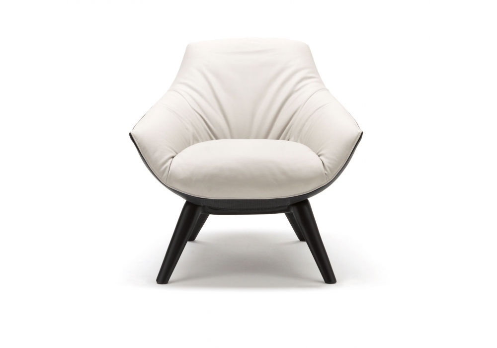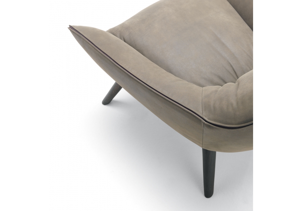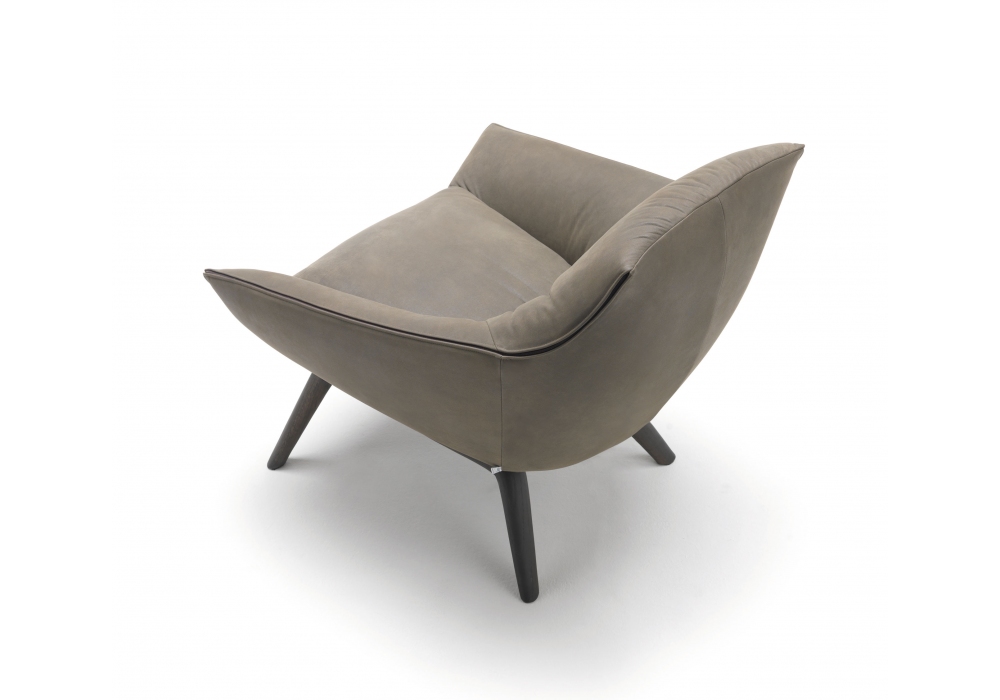 Florentia diseñada por Mauro Lipparini para MisuraEmme es una butaca realizada con una base artesanal en roble macizo teñido y carcasa de poliuretano espumado en frío con tapizado en tejido o piel, desmontable por personal experto. Bajo pedido, es posible cubrir el frente del sillón con una tela diferente a la del respaldo.