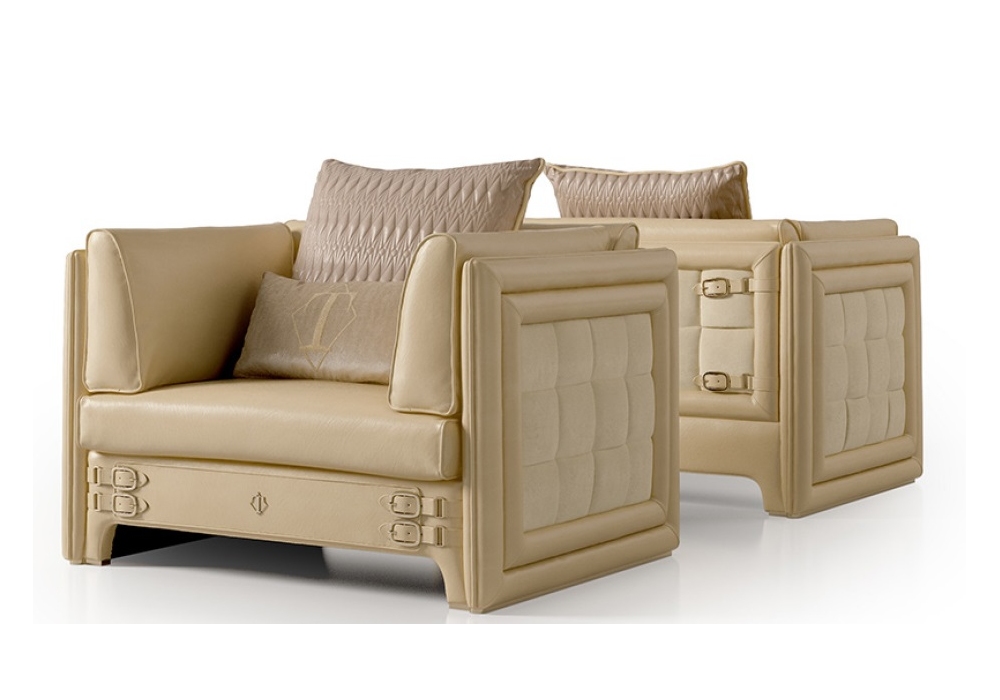 Numero Tre diseñada por Roberto Serio para Turri es una butaca con estructura en madera contrachapada y madera maciza acolchado con espuma de poliuretano multidensidad con revestimiento en diferentes tejidos o pieles. En los laterales hay paneles con estampado de cuadros tejidos. Detalles en metal dorado.