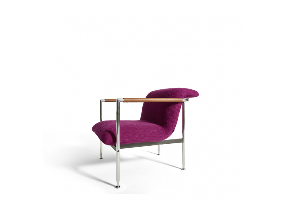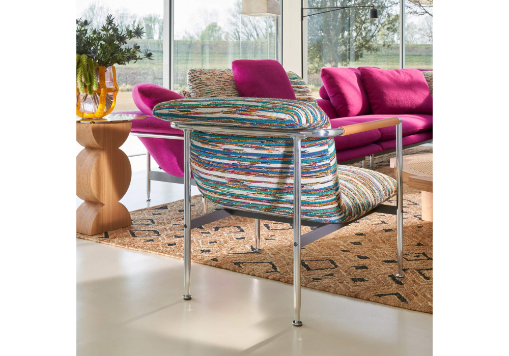Esosoft diseñada por Antonio Citterio para Cassina es una butaca realizada con base en metal pintado antracita mate, estructura tubular y tapizado en tejido. Relleno de espuma de poliuretano con un porcentaje de origen biológico y guata de PET reciclado. Reposabrazos en aluminio revestido en cuero, con costuras a mano.