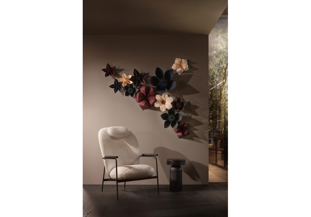 Claire diseñada por Norm Architects para Lema es una butaca con estructura en metal y reposabrazos en madera maciza. Tapicería disponible en diferentes acabados.