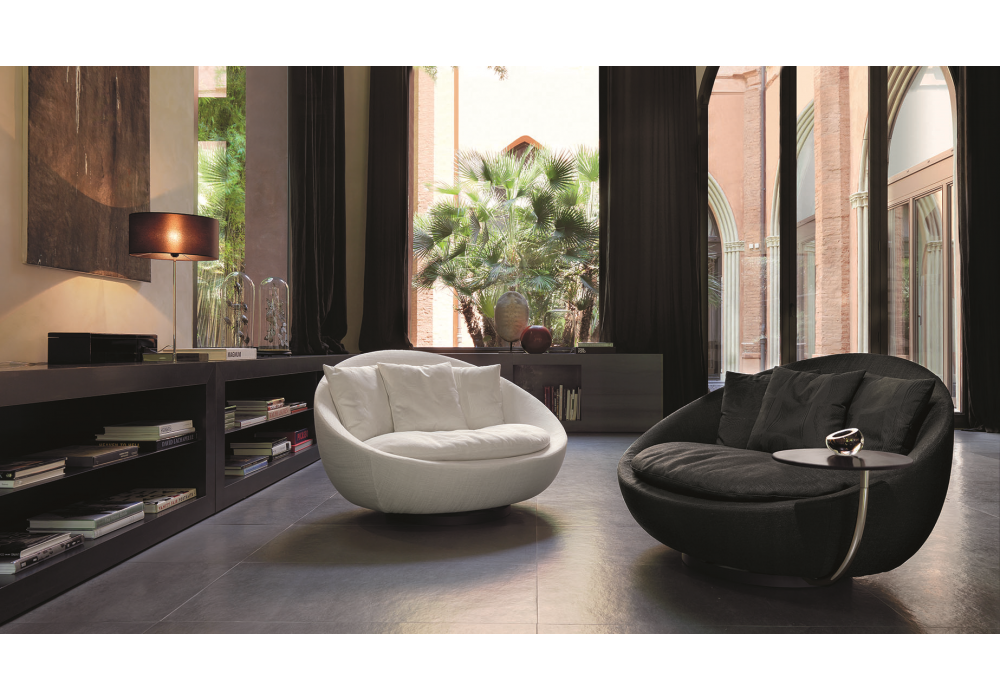 Lacoon diseñada por Jai Jalan para Désirée es una butaca con base en metal pintado negro mate, estructura en madera maciza con acolchado en poliuretano espumado en frío con revestimiento en diferentes pieles o tejidos. La base puede ser fija o giratoria.