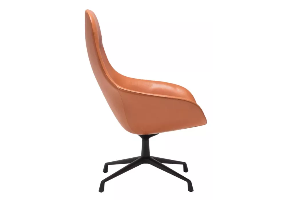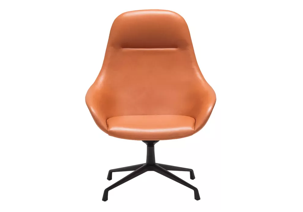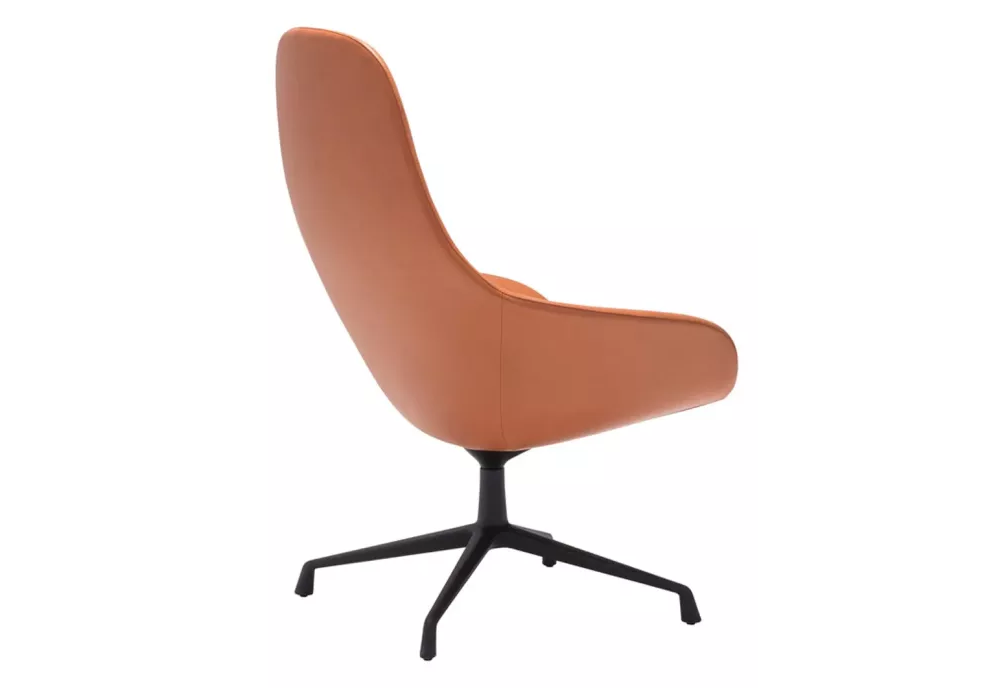 Next Lounge diseñada por Piergiorgio Cazzaniga es una silla lounge con base giratoria de 4 radios en aluminio con sistema de retorno automático y carcasa revestida en diferentes pieles, ecopiel o tejidos.