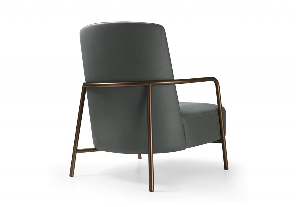Ilary diseñada por Umberto Asnago para Bodema es una butaca caracterizada por una estructura portante de metal disponible en acabados antracita y bronce. Estructura curva de madera recubierta de espuma de poliuretano de diferentes densidades. Asiento individual en poliuretano expandido. Se proporciona de serie una almohadilla de soporte lumbar de plumas, cubierta con un forro 100% algodón.