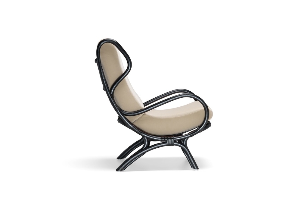 Continuum D.163.7 by Bonacina 1889 diseñada por Gio Ponti para Molteni&C es una butaca realizada con una estructura de mimbre anilina de color marrón oscuro, asiento y respaldo en poliuretano de alta resistencia de diferentes densidades con relleno en capa de fibra de poliéster, todo revestido con algodón acoplado. y fibra de poliéster. Revestimiento en tela o piel.
