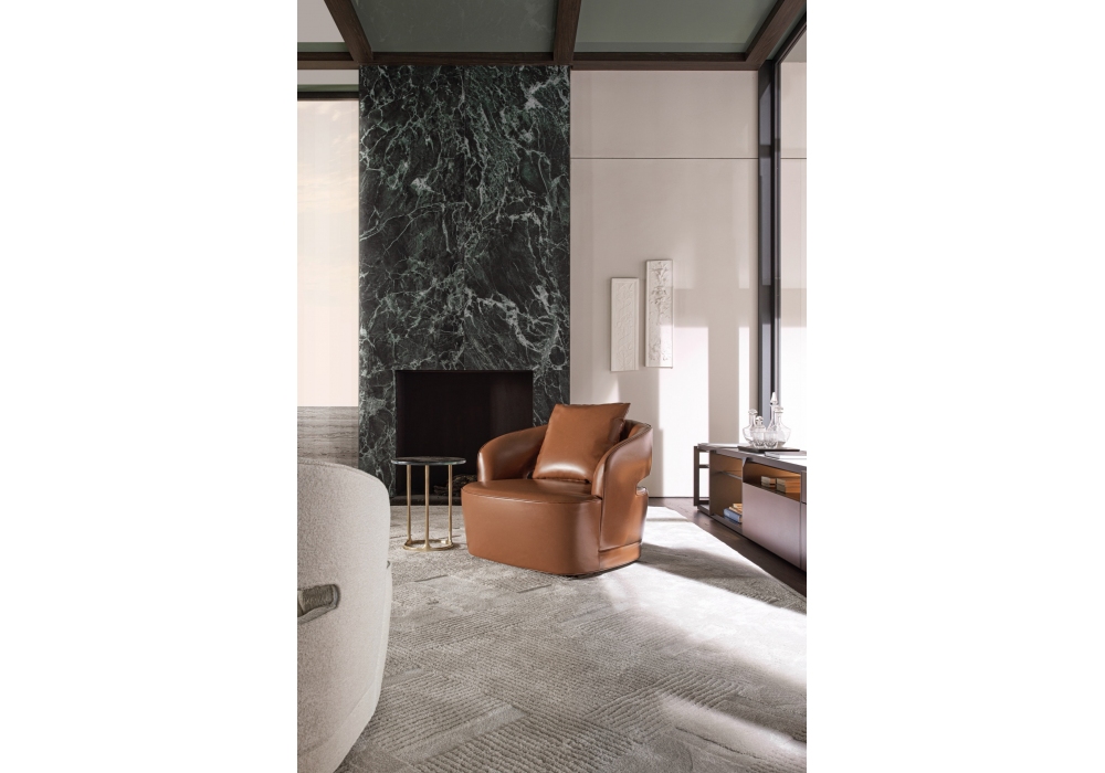 Lucio diseñada por Vincent Van Duysen para Molteni&C es una butaca realizada con estructura acolchada en espuma de poliuretano de densidad variable de alta capacidad de carga, forro en pana combinada con fibras de algodón y poliéster. Pies en aluminio pintado con puntas de plástico antideslizante y tapizado en tela o piel.