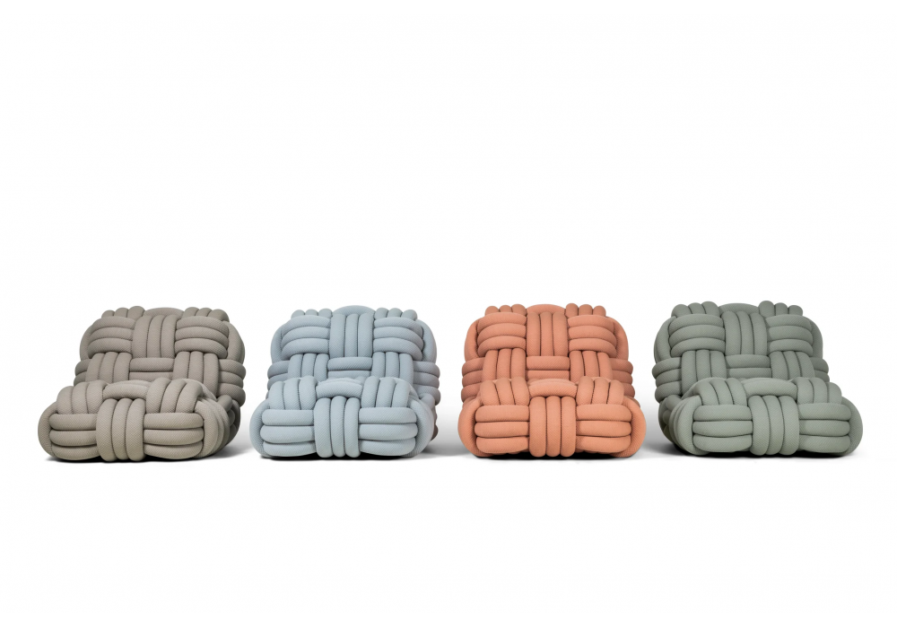 Knitty Lounge Chair diseñada por Nika Zupanc para Moooi es una butaca realizada con un "hilo" extra grande que recuerda las cuerdas de los barcos gigantes. Estructura de madera, muelles de acero, espuma. Disponible en diferentes acabados.