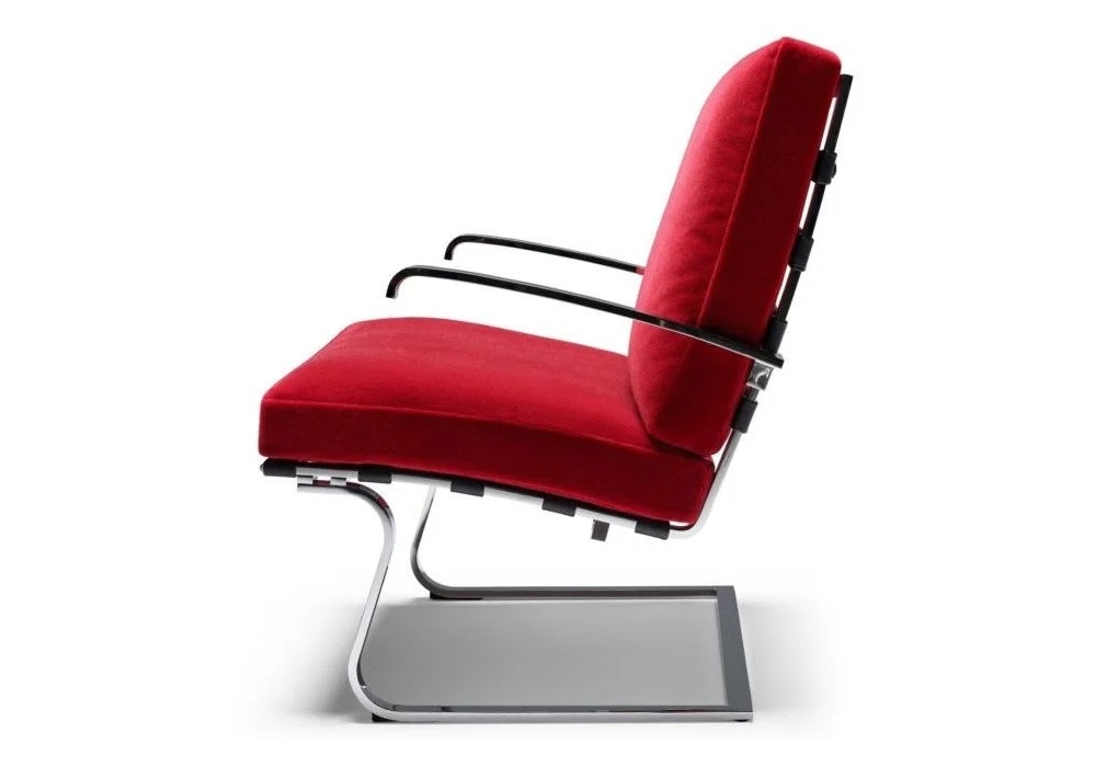 Tugendhat diseñada por Ludwig Mies van der Rohe para Knoll es una butaca con estructura de acero en acabado cromado o con pintura epoxi ónix ultramate. Correderas de plástico negro. Tapicería desenfundable en tela o piel con correas de piel en el respaldo. Disponible en versión con o sin brazos