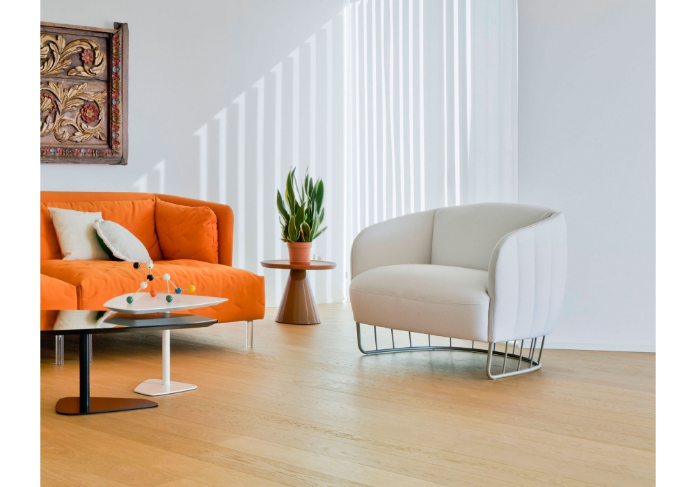 Tonella diseñada por Note Design Studio para Sancal es una butaca con base en bronce brillo o metal lacado mate en diferentes colores, tapizado en tela o piel en diferentes acabados. Bajo pedido, posibilidad de elegir la versión bicolor.