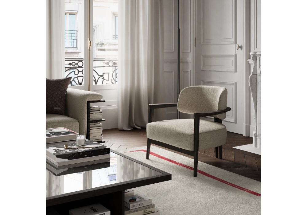 Saint-Germain diseñado por Matteo Nunziati para Karl Lagerfeld Maison es un sillón con estructura de madera disponible en los siguientes acabados: nogal americano mate, roble teñido oscuro, roble teñido gris mate, bambú café negro mate. También existen varios tejidos para el revestimiento de los cojines del respaldo y del asiento.