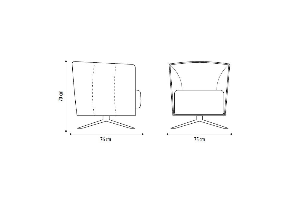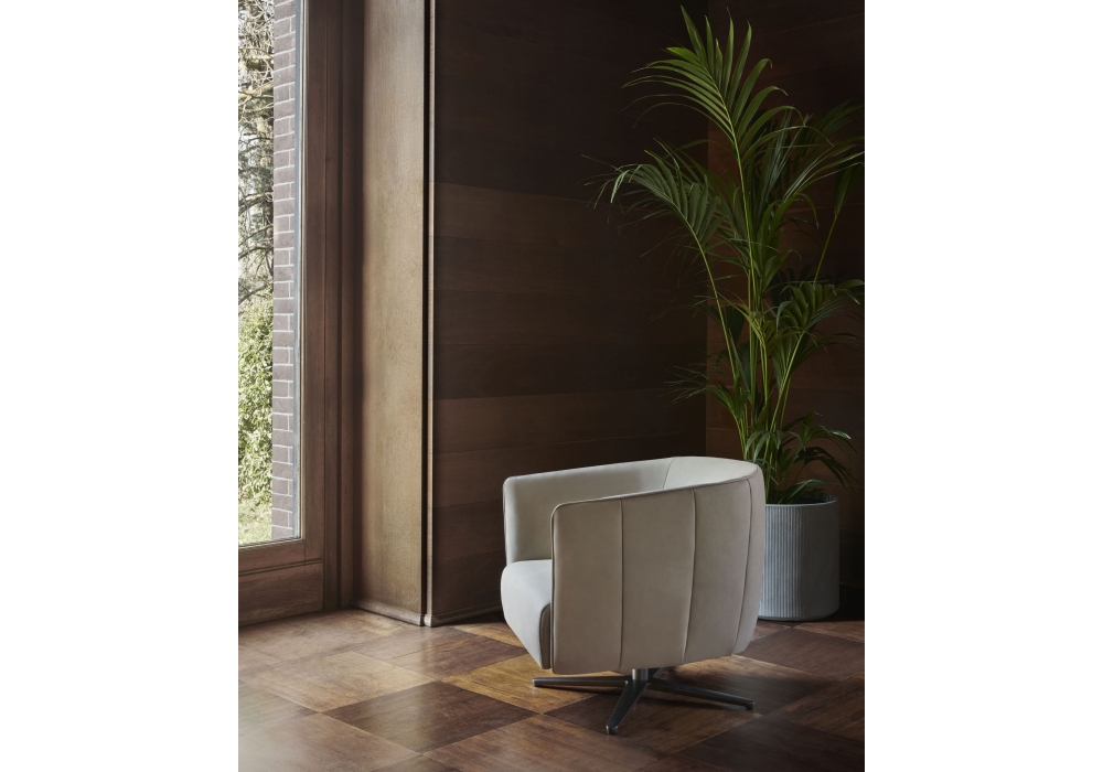 Holly diseñada por Dainelli Studio para Conte Casa es una butaca acolchada con base de metal realizado con tapizado de tela o piel.