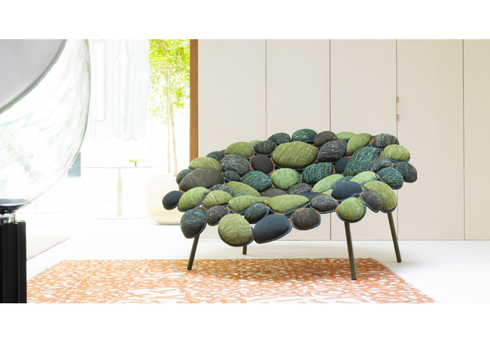 Miriade diseñada por Estúdio Campana para Paola Lenti es una butaca con colchón revestido de malla lisa, compuesto por elementos ribeteados y unidos entre sí para formar un asiento único y diferente. La estructura es de acero inoxidable AISI 316 pintado mate.