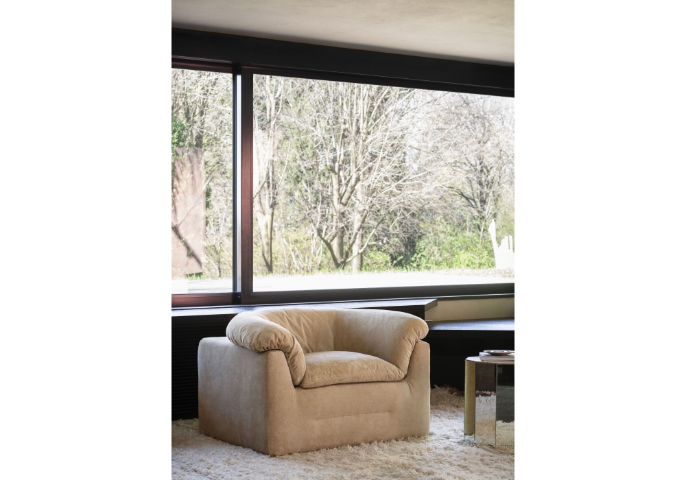 Butter, diseñada por Faye Toogood para Tacchini, es un sillón que combina estética contemporánea y confort informal en perfecto equilibrio. Fabricado con estructura interna de madera y relleno de espuma de poliuretano multidensidad, garantiza resistencia, soporte y durabilidad en el tiempo. El tapizado, disponible en tela o piel, resalta sus formas suaves y acogedoras. Diseñado para adaptarse naturalmente a los movimientos del cuerpo sin imponer una postura rígida, cuenta con un asiento amplio y un respaldo envolvente que invitan al relax.