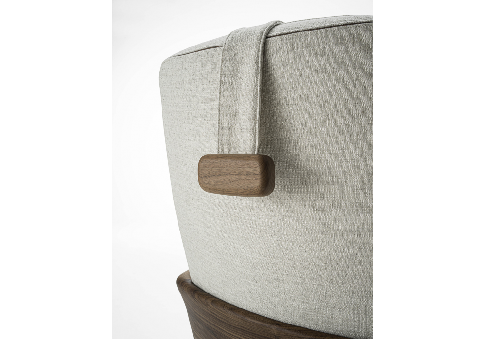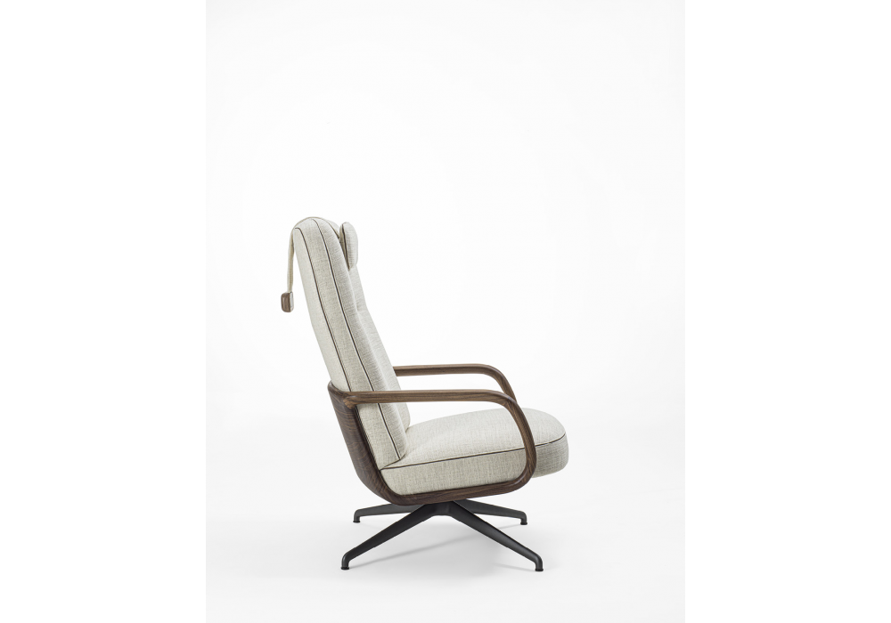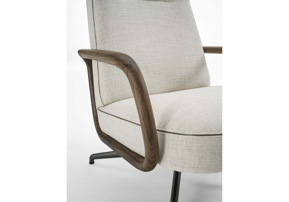 Cuna Lounge High diseñada por Emmanuel Gallina para Porada es una butaca de respaldo alto con una base giratoria de metal y mecanismo de retorno. La estructura interna del respaldo y el asiento es de contrachapado, mientras que el tapizado exterior está disponible en tejidos de la colección, con un ribete negativo cosido entre las dos costuras. La carcasa exterior es de nogal Canaletta macizo con reposabrazos integrados. El reposacabezas extraíble, disponible en tela, cuenta con un contrapeso de nogal Canaletta macizo. Se puede añadir una otomana Cuna Lounge.