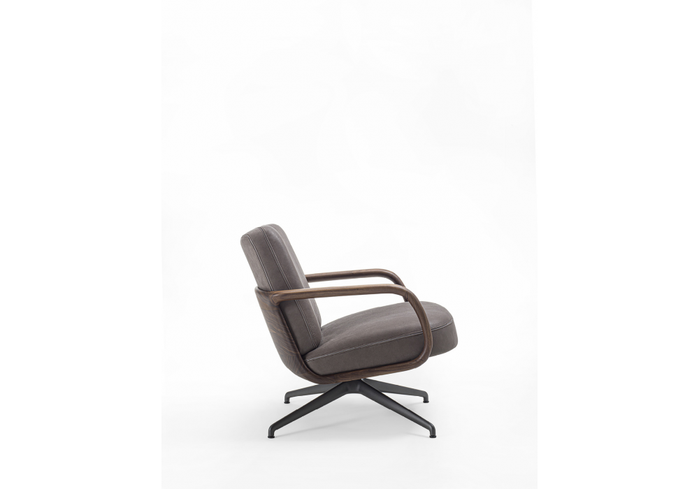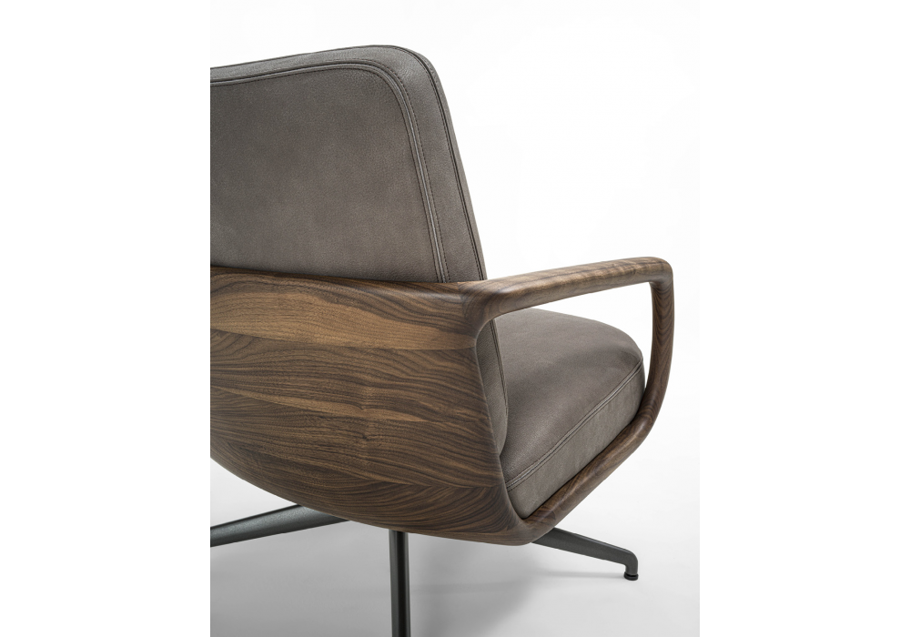 Cuna Lounge Low diseñada por Emmanuel Gallina para Porada es una butaca de respaldo bajo con una base giratoria de metal y mecanismo de retorno. La estructura interna del respaldo y el asiento es de contrachapado, mientras que el revestimiento exterior es de tejidos de la colección y presenta un ribete negativo cosido entre las dos costuras. La carcasa exterior es de nogal canaletta macizo con reposabrazos integrados. Se puede añadir una otomana Cuna Lounge.