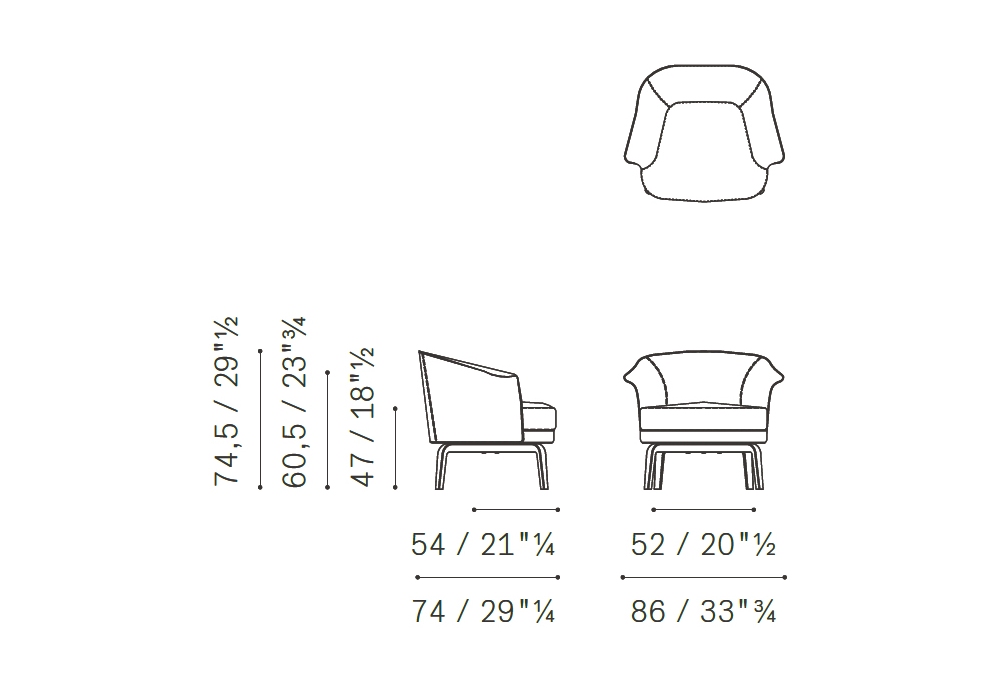 The shell of the backrest is in moulded polyurethane foam, lightly padded with polyester wadding. The seat is in seasoned beech padded with polyurethane foam and pressed felt, and is sprung with elastic belts. The seat cushions are in goose feather with stabilising insert in polyurethane foam to reduce sinking while ensuring comfort. The base has four feet and is in wengé-stained ash.