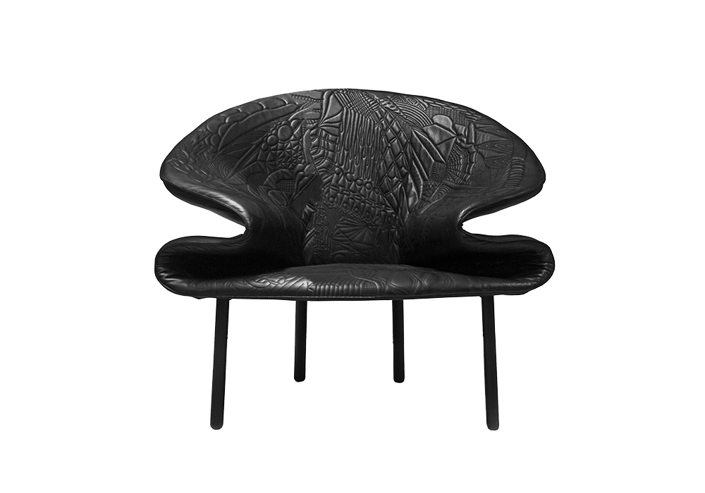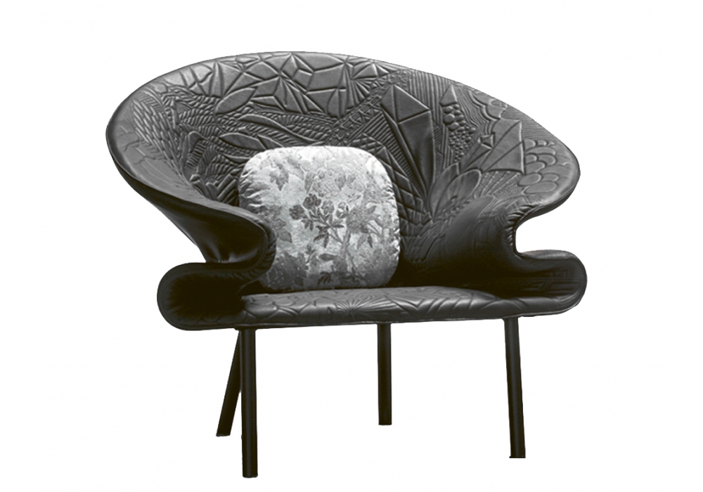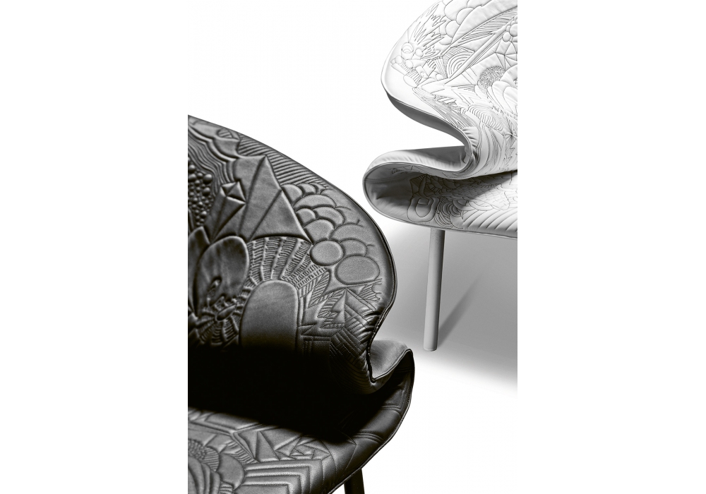 Doodle diseñada por Front para Moroso es una butaca realizada en poliuretano espumado en frío y fibra de poliéster con estructura interna en resina y acero. Pies en tubo de acero pintado en polvo y revestidos en piel con plantillas de polipropileno enro. Forro de piel bordado.