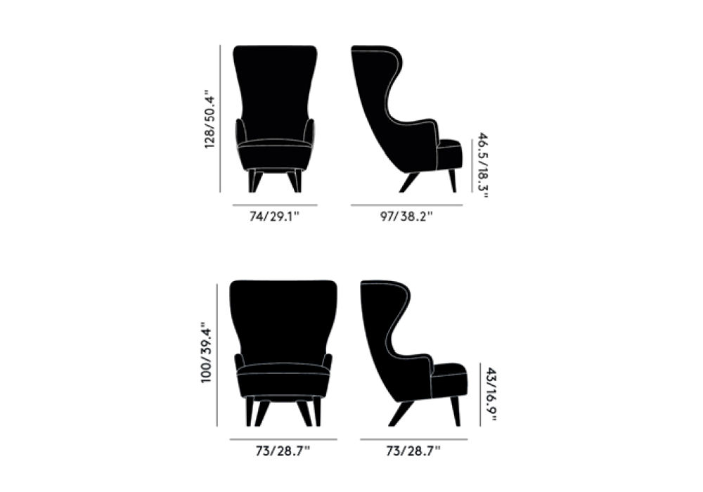 Wingback Chair diseñada por Tom Dixon es una butaca realizada con patas de roble negro y tapizado en tela en diferentes acabados. Disponible en dos dimensiones.