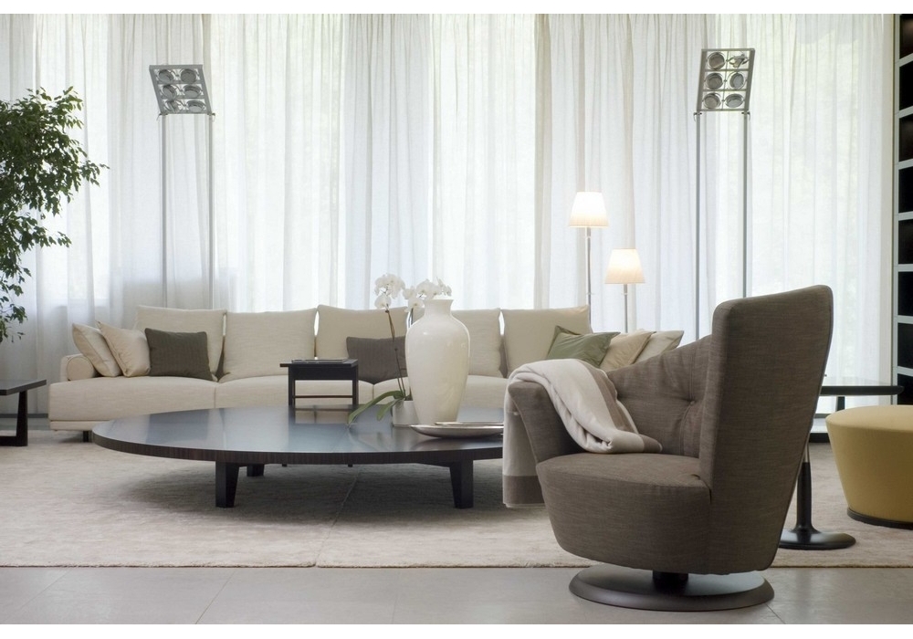 Arabella is a swivel armchair designed by Carlo Giorgetti and Massimo Scolari for Giorgetti. Swivel armchair available with right or left arm and varnished base structure in bronze finish. The frame is in multi-layer poplar wood. The backrest has an internal frame made up of harmonic steel springs that enables the elasticity and makes the support ergonomic. The padding of the seat and of the backrest is in flexible multi-density expanded polyurethane, covered with polyester fibre. The base is composed of a wood fibre panel covered with varnished turned metal in bronze finish and of a steel device with ball bearing for the rotation. The spring-loaded wheels of the base allow the piece to be moved easily. The upholstery, completely removable, is available in fabric or leather. A stretch fabric connects the several parts of the back upholstery facilitating the elasticity. An elastic string fixes the buttons allowing the cover to be removed. A cushion in polyester fibre covered with fabric or leather completes the armchair.