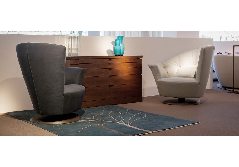 Arabella is a swivel armchair designed by Carlo Giorgetti and Massimo Scolari for Giorgetti. Swivel armchair available with right or left arm and varnished base structure in bronze finish. The frame is in multi-layer poplar wood. The backrest has an internal frame made up of harmonic steel springs that enables the elasticity and makes the support ergonomic.