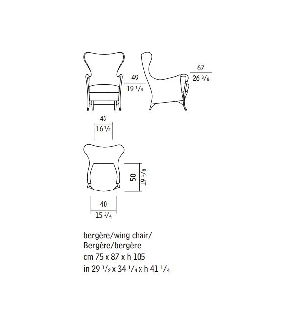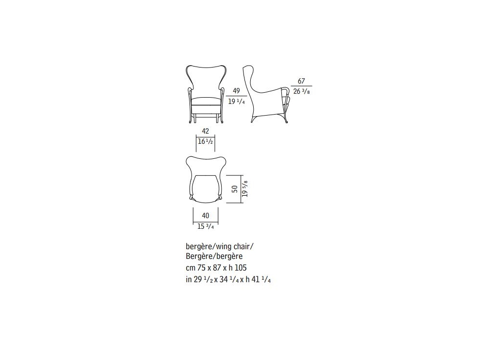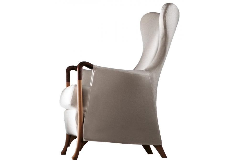 Progetti diseñado y creado por Centro Ricerche Giorgetti es un bergère bajo con un marco de haya maciza con patas pulidas o lacadas. Los apoyabrazos son de pau ferro pulido. El acolchado del asiento y respaldo es de espuma de poliuretano, con tapizado disponible en tela o piel, en diferentes acabados.