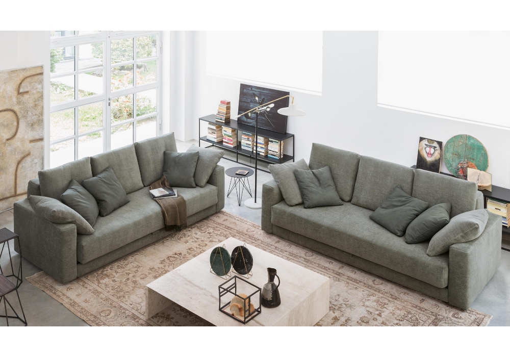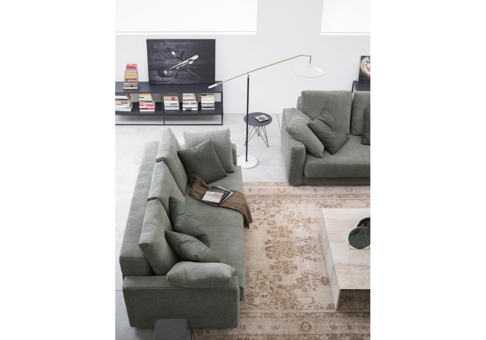PiazzaDuomo diseñada por Giulio Manzoni para Flou es una síntesis ideal entre sofá y cama; PiazzaDuomo ofrece soluciones flexibles para solucionar los problemas de espacio, a la luz de un código de elegancia contemporánea. Un nuevo concepto del vivir que demuestra cuán fácil sea convertir el salón en una habitación, no con el clásico transformable sino con un sofá que, con pocos gestos, se vuelve una cama individual o de matrimonio y, de manera igualmente sencilla, vuelve a su posición original. El asiento está enriquecido por tres cojines tapizados como el sofá en tejido o piel extraíble gracias a las cremalleras.