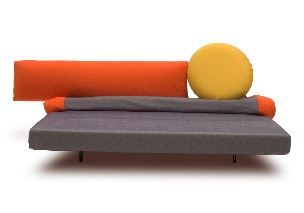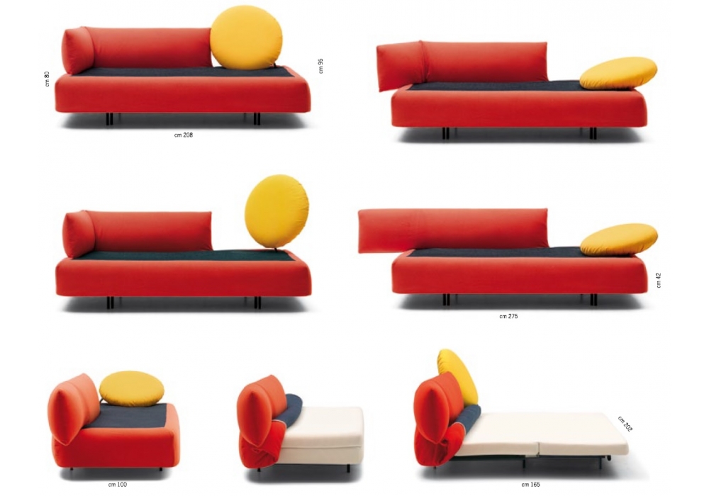 Oblò diseñado por Vico Magistretti para Campeggi es un sofà-cama convertible que se puede transformar fácilmente en una chaise longue, una cama individual o una cama matrimonial. El grande cojín redondo puede ser tanto un respaldo como un cojín relajante. Estructura en acero acolchado en espuma de poliuretano y fibra. Somier en listones de madera con colchón en espuma de poliuretano.