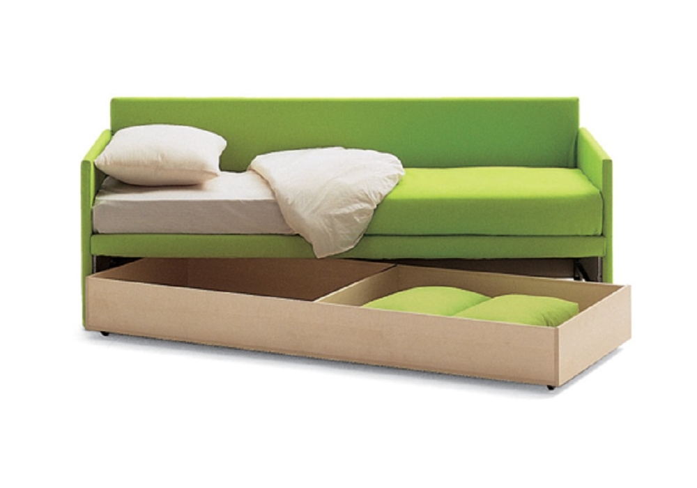 Sky Due diseñado por Campeggi es un sofà-cama con una cama extraíble o un contenedor de madera. Somier con listones de madera y colchón en espuma de poliuretano o colchón de muelles. Revestimiento desmontable.